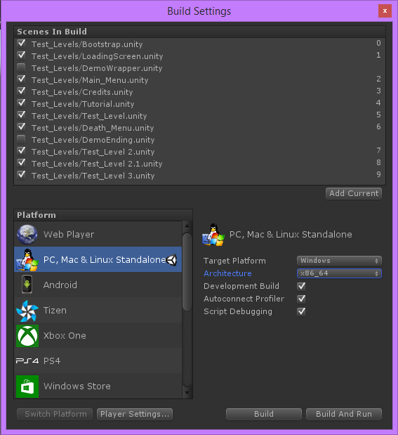[MenuItem("Builds/Win 64bits/DRM Free")] public static void BuildWin64NoDRM() { string[] levels = new string[] { "Assets/Test_Levels/LoadingScreen.unity", "Assets/Test_Levels/Main_Menu.unity", "Assets/Test_Levels/Credits.unity", "Assets/Test_Levels/Tutorial.unity", "Assets/Test_Levels/Test_Level.unity", "Assets/Test_Levels/Death_Menu.unity" }; UnityEditor.PlayerSettings.runInBackground = false; string message = BuildPipeline.BuildPlayer( levels, "../Builds/DRMFree/Win64/GameTitle.exe", BuildTarget.StandaloneWindows64, BuildOptions.ShowBuiltPlayer); if (string.IsNullOrEmpty(message)) UnityEngine.Debug.Log("Win64 build complete"); else UnityEngine.Debug.LogError("Error building Win64:\n" + message); }