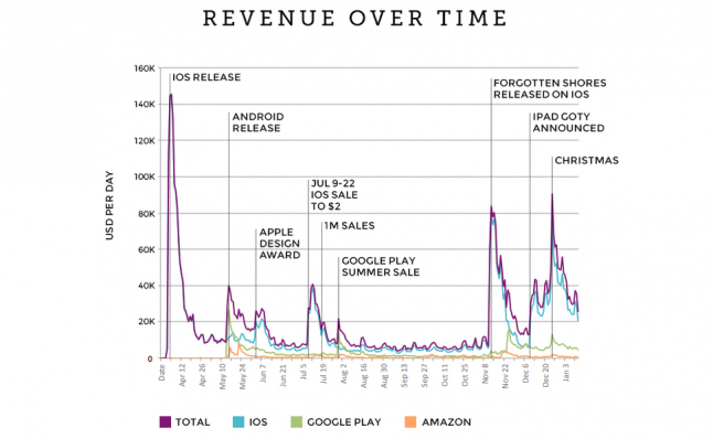 Notable datapoints of interest for developers include the fact that the iOS version of Monument Valley accounted for roughly 70 percent of all sales (1.7 million of the game's 2.4 million official sales) and over 81 percent of all revenue, as a portion of the game's sales were as a free download on the Amazon App Store.