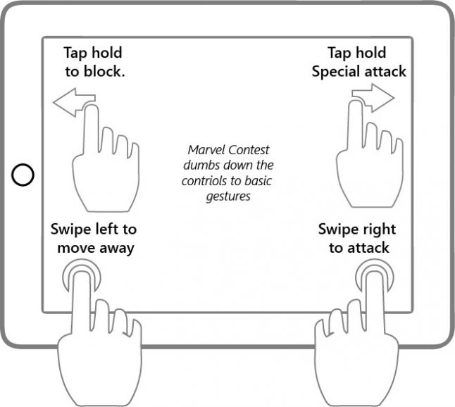 Marvel Contest, in contrast, dilutes these inputs to just few taps and swipes which is sensible for mobile devices as affordance for distractions is high and supporting muti-touch input of different fingers together is cumbersome.