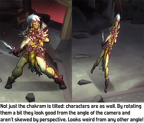 The Chakram is a horizontally flying circular thingy. With the relatively low camera of Blightbound it was seen under too extreme an angle, making it look too flat. We didn't want to turn it into a 3D model though since we wanted to maintain the 2D, handpainted feel of the graphics. The solution is simple: the Chakram is tilted towards the camera a bit. This is subtle enough that it feels like the Chakram is horizontal, but it adds just enough angle that it looks a lot less flat. This is a technique that we use a lot in Blightbound.