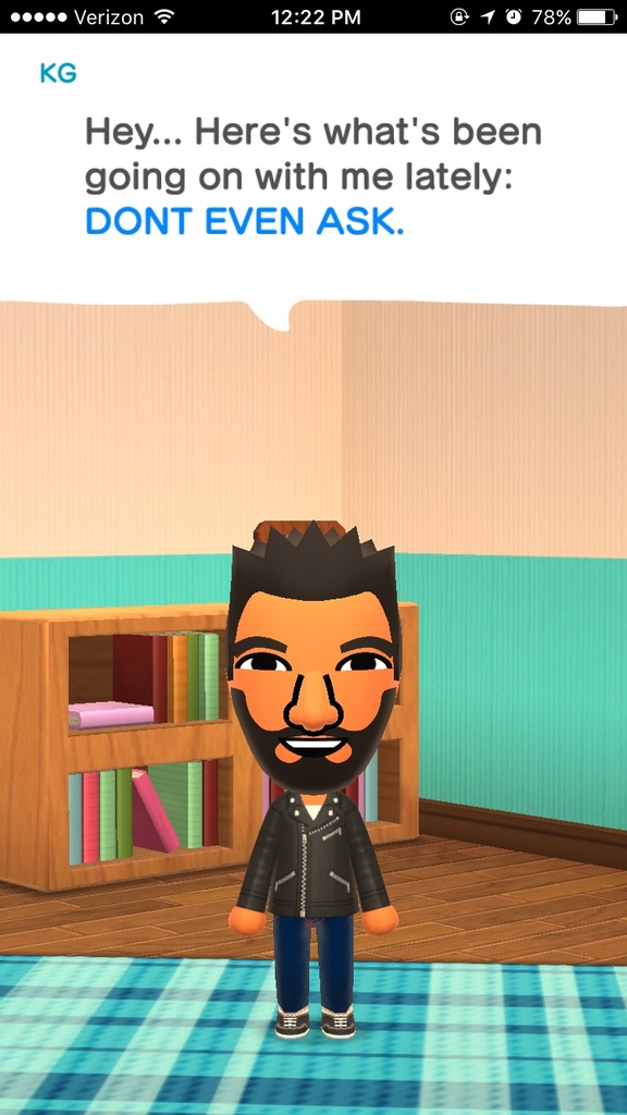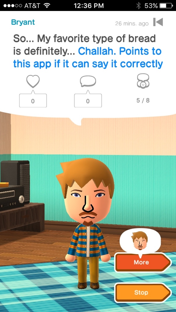 CB: The voice work is impressive, and so's the appropriate body language and reactions that frequently accompany the speech. My friend will write some bizarre response, and Miitomo picks up the context and is appropriately ecstatic or angry or miserable as it delivers that response to me. Very impressive when it gets that just right; hilarious and bizarre when it gets the emotional valence perfectly wrong.
