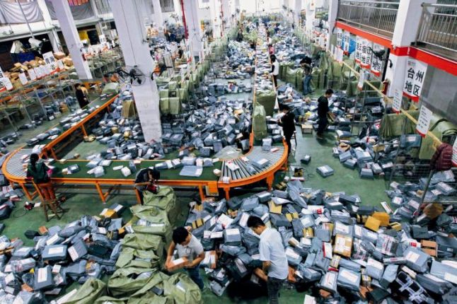 Inside of a station of a express company in Zhejiang Province, workers do their daily job of handling packages sent by Taobao stores.