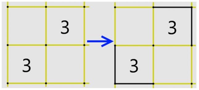 Also, when two 3s are diagonally-adjacent, the outermost “bracketing” lines must be filled. It takes a little more thought to see why this is so. It’s a consequence of Observations 1 and 4. When the line comes to a “3” square, it must wind around three of its corners. If one of these bracketing lines were empty, the other three would have to be full, which would in turn mean two of the other three’s sides would have to be empty.