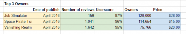 My process was simple. First I search for VR games on Steam with the label VR Only. Then I take a look at steam pages. Then I look up the data on Steam Spy (when available). It took a while so I only fetched 40 games with 20 reviews or more. The games were between 5 april 2016 and 31 january 2017.