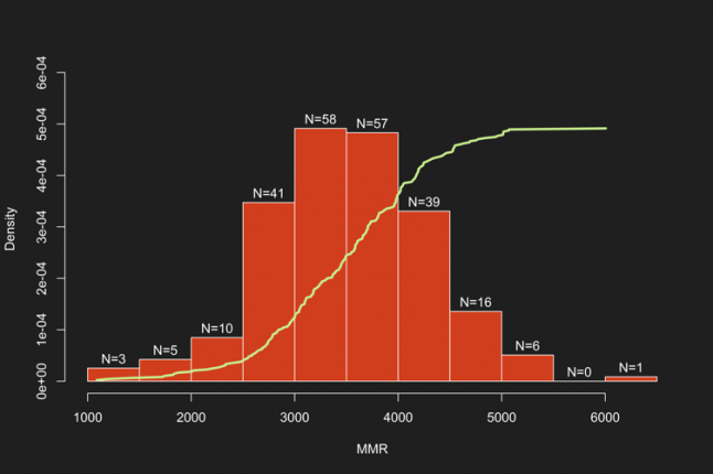 Look at that nice bell curve. This distribution really shows just how great of an opportunity these tournaments present in terms of reaching a strong sample of the Dota 2 player population. Being able to reach this level of skilled individuals really lends a lot of depth to the study.