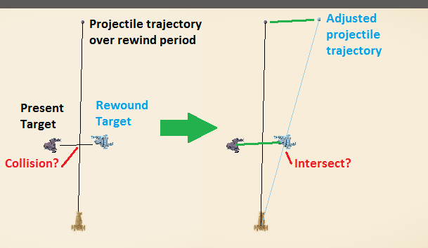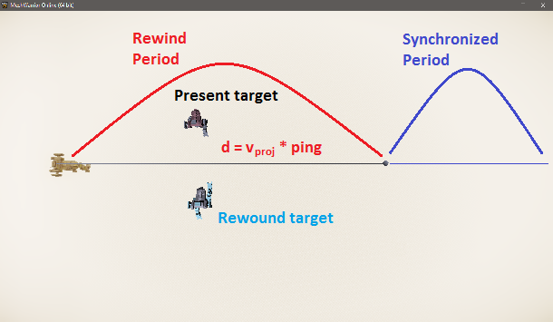 If we ignore the rewind period for now, the server can make the client’s prediction correct or synchronize with the client by simply spawning the projectile the distance it has travelled ahead from its normal spawning position. In other words, the server will not fire the projectile from the barrel of the weapon, but instead fire it ahead by distance units along its trajectory. If the projectile has more complex physics the server may also need to calculate the appropriate velocity and acceleration the projectile should have at that point along its trajectory. Assuming the projectile moves deterministically, it should now travel in a synchronized trajectory between the client and server. That's easy enough, so what do we do about the rewind period?