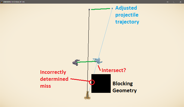 Solving this problem is equivalent to solving the tunneling problem I mentioned earlier. You can imagine that the projectile travels from its starting position to the end of its rewind period in a single tick – checking if a collision occurs during the motion of these objects between their start and end points is a continuous collision detection test. It is important to note that this check is not the same as a normal line trace. We intentionally ignore the rest of the world and only consider the rewound target and the adjusted trajectory – this is a very important detail. If we don’t ignore the rest of the world, we can erroneously get a result that tells us a collision is not possible when it actually should be. For example, if the player is standing next to a wall, we could end up with false negatives. This is illustrated below.