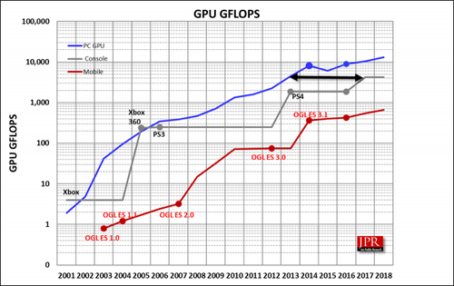 Now let’s look at the above comparative table (sourced from Jon Peddie Research) of mobile to console to PC processing power. The PC always comes out on top and provides more processing power year over year in the CPU, the CPU memory speed and size, the GPU, and the GPU’s memory and size. In the past, the consoles have had brief periods where they were at the same computational level as a PC, though quickly lost out as PC enhanced and console plateaued while it waited for its next iteration console release. Finally, we have mobile which is easily 10 years behind PC, and 3 – 5 years behind consoles.