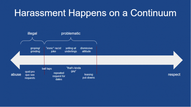 To sum it all up, Greer pointed out that most modern companies, in their anti-harassment policies, are focused on retributive punishment for illegal behavior. But on the pathway to illegal behavior, you get a number of other toxic behaviors like asking coworkers on a date, "ironic" racist jokes, or even just teasing put-downs.