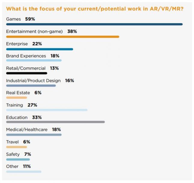 As an example of what you'll get in the full (free!) report, today we'd like to highlight a particularly notable finding regarding how many AR/VR/MR developers are working on games. The first step to figuring out where AR/VR/MR devs are at this year is to find out what they’re working on, so we asked our survey respondents to tell us the focus(es) of their current or potential work in the field.