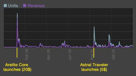 In 2017, I released two games on Steam. The first was Arelite Core, a retro-style JRPG released on February 8th after four and a half years of development. Over 85 000 USD in production costs went to contracting artists and a music composer. Released only for Windows, it has thus far made less than 5000$ across all distribution platforms.